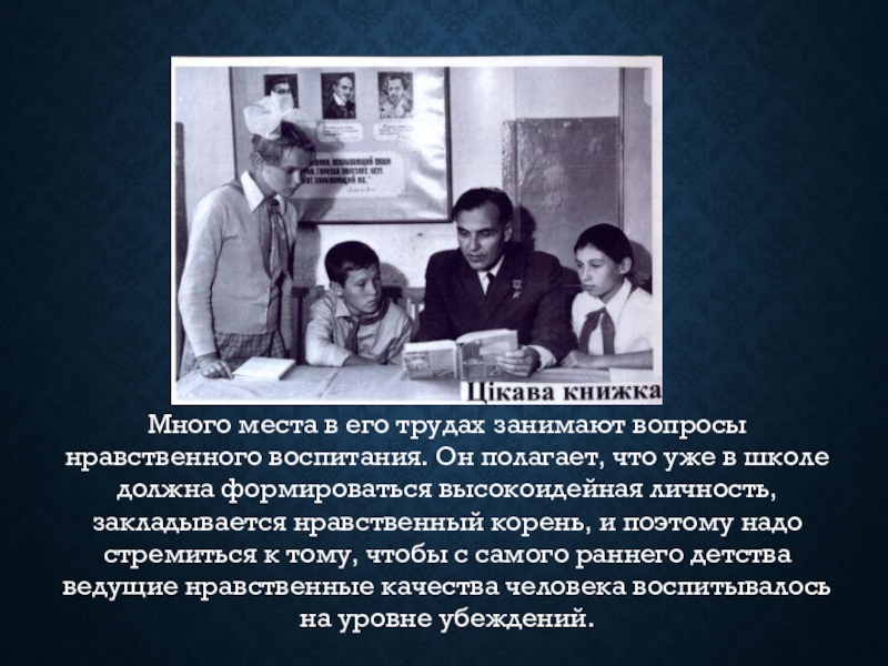 Слайд 14Много места в его трудах занимают вопросы нравственного воспитания. Он полагает,