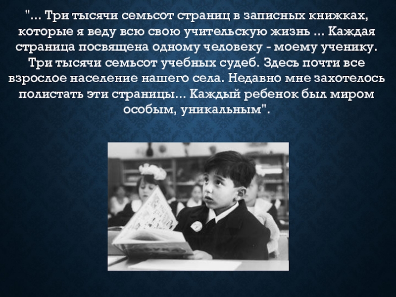 всю свою учительскую жизнь ... Каждая страница посвящена одному человеку - моему ученику. Три тысячи семьсот учебных судеб. Здесь почти все взрослое население нашего села. Недавно мне захотелось полистать эти страницы... Каждый ребенок был миром особым, уникальным".