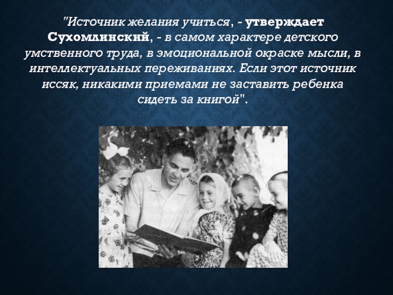 Слайд 13"Источник желания учиться, - утверждает Сухомлинский, - в самом характере детского