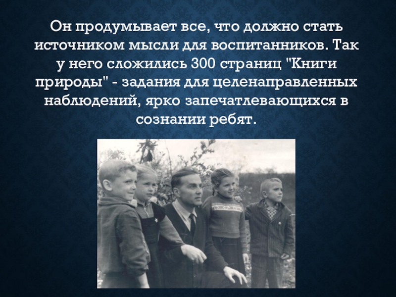 у него сложились 300 страниц "Книги природы" - задания для целенаправленных наблюдений, ярко запечатлевающихся в сознании ребят.