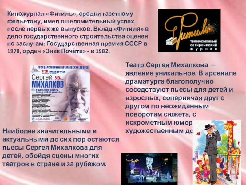 Наиболее значительными и актуальными до сих пор остаются пьесы Сергея Михалкова для детей, обойдя сцены многих театров в стране и за рубежом.