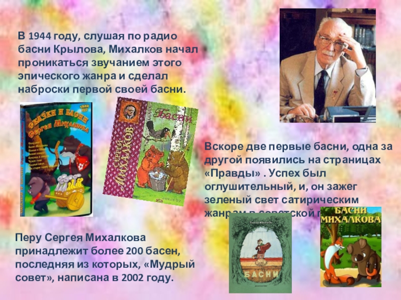 Перу Сергея Михалкова принадлежит более 200 басен, последняя из которых, «Мудрый совет», написана в 2002 году.
