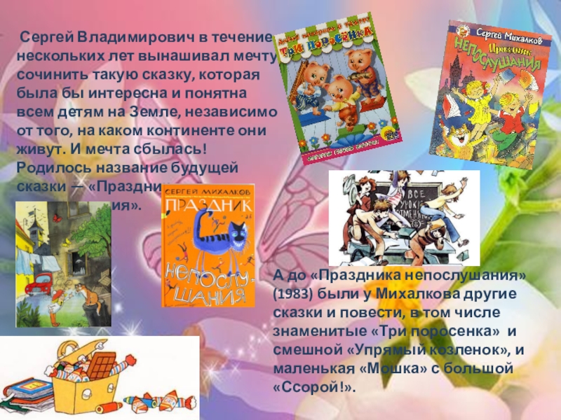 А до «Праздника непослушания» (1983) были у Михалкова другие сказки и повести, в том числе знаменитые «Три поросенка» и смешной «Упрямый козленок», и маленькая «Мошка» с большой «Ссорой!».