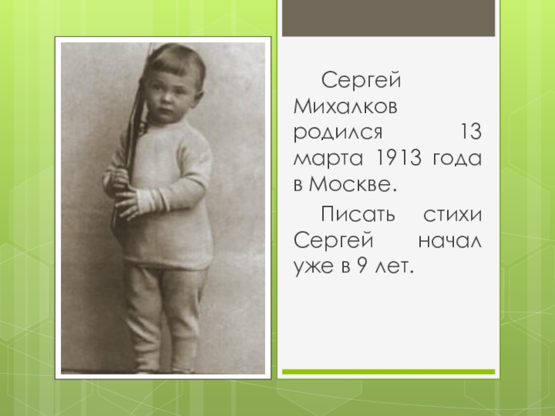 Сергей Михалков родился 13 марта 1913 года в Москве. Писать стихи Сергей начал уже в 9 лет.