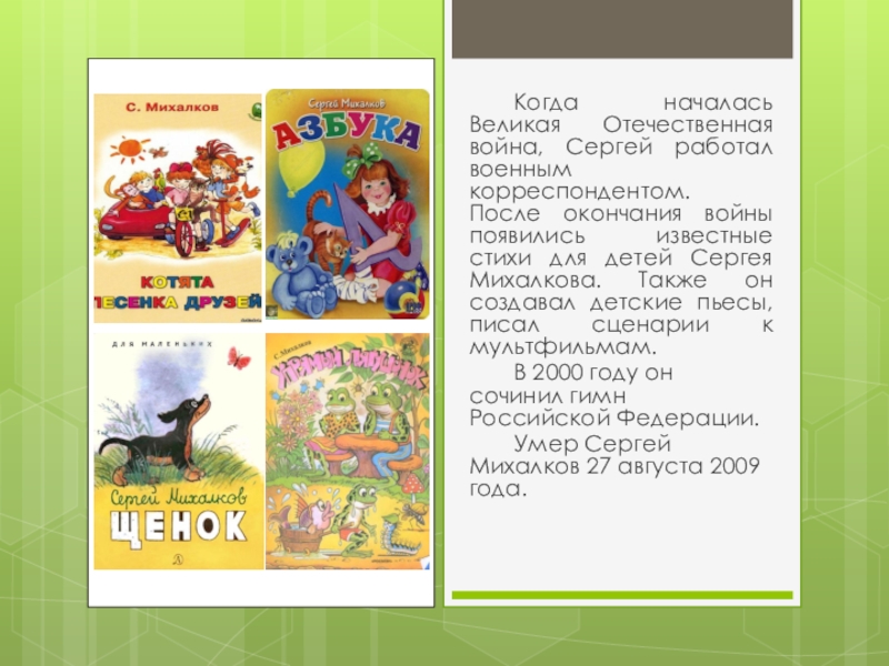 войны появились известные стихи для детей Сергея Михалкова. Также он создавал детские пьесы, писал сценарии к мультфильмам.