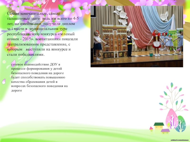 но именно они получили диплом за i место в муниципальном туре республиканского конкурса «зеленый огонек - 2015». воспитанники показали театрализованное представление, с которым выступили на конкурсе и стали победителями.