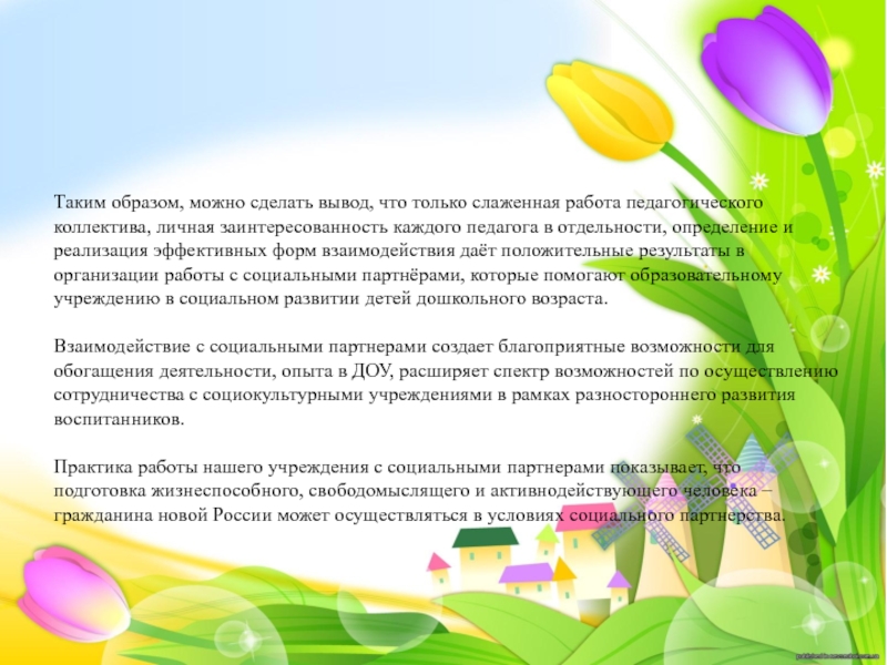 личная заинтересованность каждого педагога в отдельности, определение и реализация эффективных форм взаимодействия даёт положительные результаты в организации работы с социальными партнёрами, которые помогают образовательному учреждению в социальном развитии детей дошкольного возраста.