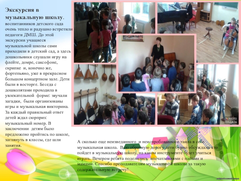 педагоги ДМШ. До этой экскурсии учащиеся музыкальной школы сами приходили в детский сад, а здесь дошкольники слушали игру на флейте, домре, саксофоне, скрипке и, конечно же, фортепьяно, уже в прекрасном большом концертном зале. Дети были в восторге. Беседа с дошколятами проходила в увлекательной форме: звучали загадки, были организованы игры и музыкальная викторина. За каждый правильный ответ детей ждал сюрприз: музыкальный номер. В заключении детям было предложено пройтись по школе, заглянуть в классы, где шли занятия.