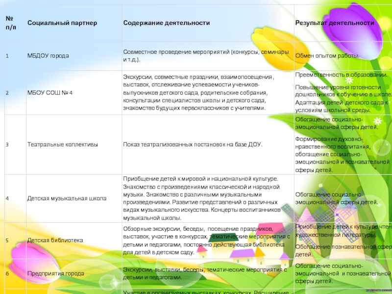 Взаимодействие с социальными партнерами создает благоприятные возможности для обогащения деятельности, опыта в ДОУ, расширяет спектр возможностей по осуществлению сотрудничества с социокультурными учреждениями в рамках разностороннего развития воспитанников.