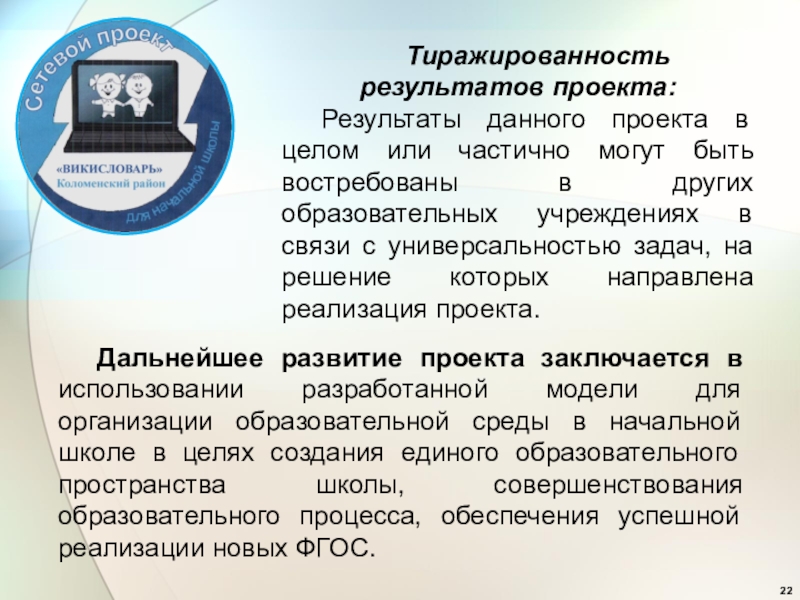 Результаты данного проекта в целом или частично могут быть востребованы в других образовательных учреждениях в связи с универсальностью задач, на решение которых направлена реализация проекта.