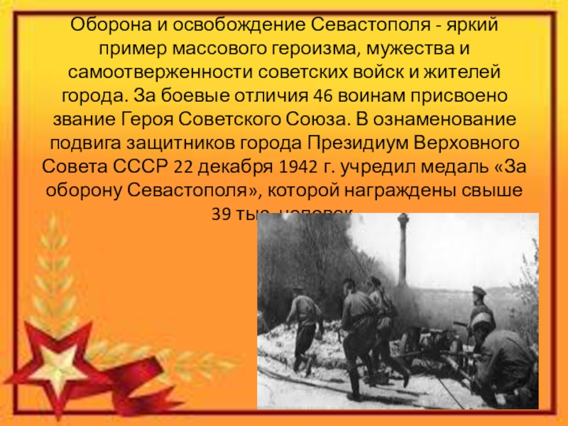 самоотверженности советских войск и жителей города. За боевые отличия 46 воинам присвоено звание Героя Советского Союза. В ознаменование подвига защитников города Президиум Верховного Совета СССР 22 декабря 1942 г. учредил медаль «За оборону Севастополя», которой награждены свыше 39 тыс. человек.