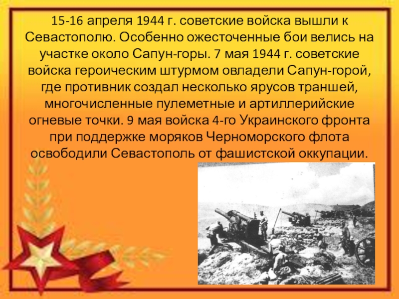 Слайд 1015-16 апреля 1944 г. советские войска вышли к Севастополю. Особенно ожесточенные