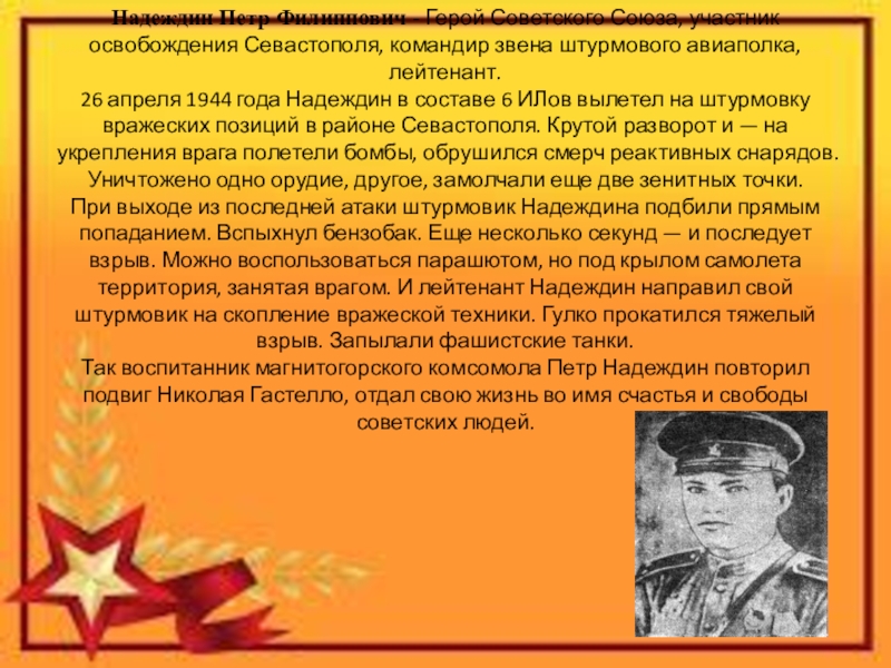 Слайд 15Надеждин Петр Филиппович - Герой Советского Союза, участник освобождения Севастополя, командир