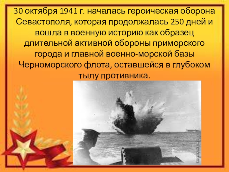 Слайд 430 октября 1941 г. началась героическая оборона Севастополя, которая продолжалась 250