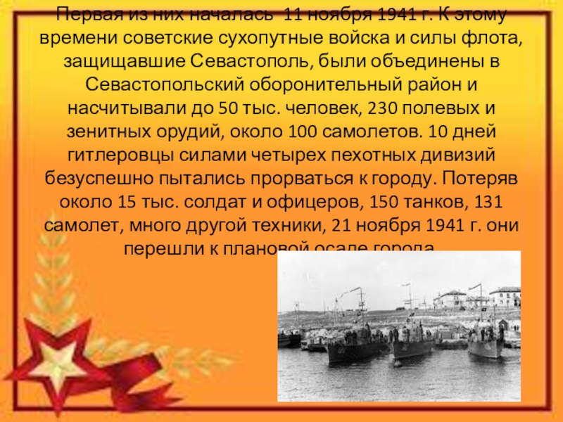 советские сухопутные войска и силы флота, защищавшие Севастополь, были объединены в Севастопольский оборонительный район и насчитывали до 50 тыс. человек, 230 полевых и зенитных орудий, около 100 самолетов. 10 дней гитлеровцы силами четырех пехотных дивизий безуспешно пытались прорваться к городу. Потеряв около 15 тыс. солдат и офицеров, 150 танков, 131 самолет, много другой техники, 21 ноября 1941 г. они перешли к плановой осаде города.