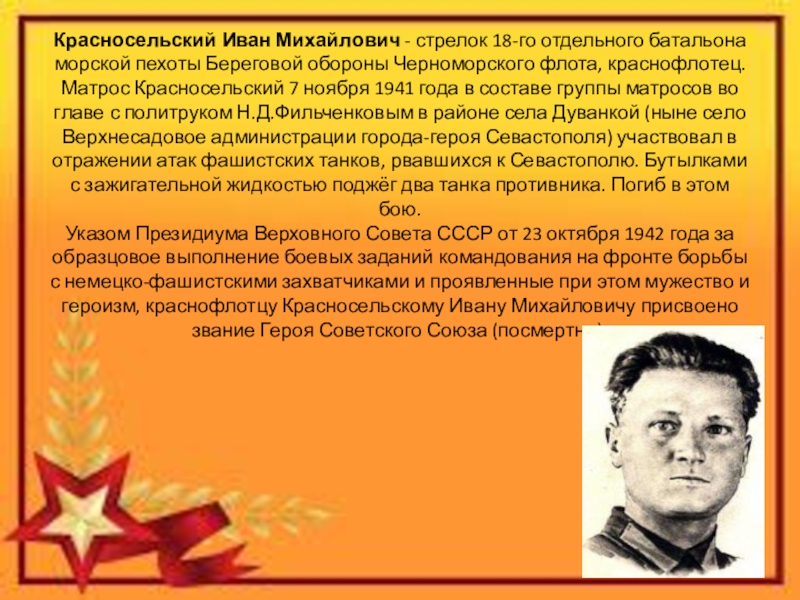 Слайд 13Красносельский Иван Михайлович - стрелок 18-го отдельного батальона морской пехоты Береговой