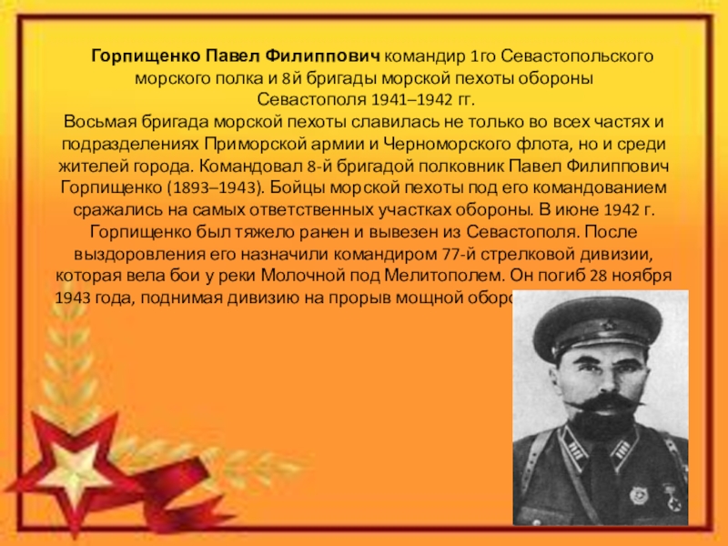 Слайд 16 Горпищенко Павел Филиппович командир 1го Севастопольского морского полка и 8й