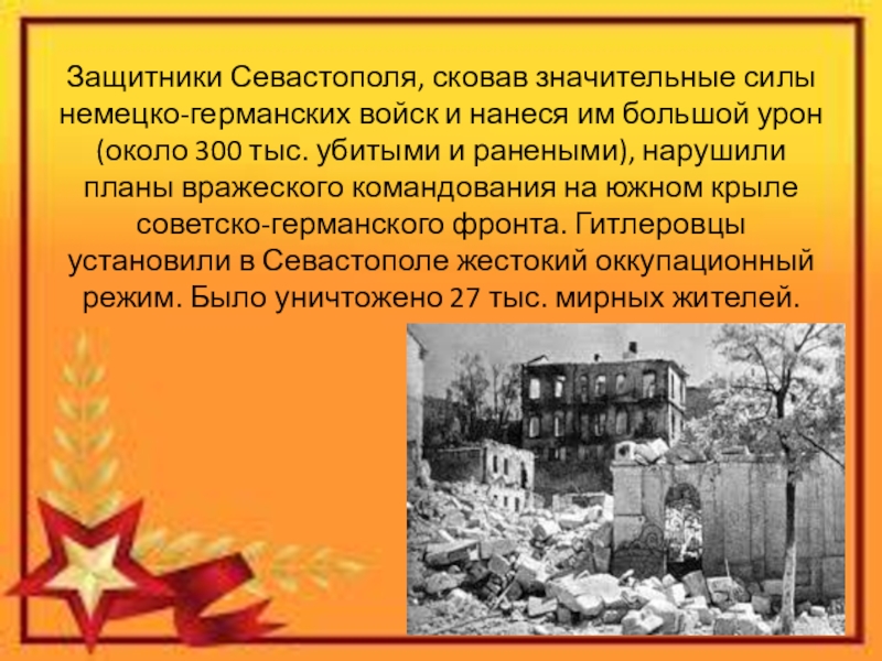 урон (около 300 тыс. убитыми и ранеными), нарушили планы вражеского командования на южном крыле советско-германского фронта. Гитлеровцы установили в Севастополе жестокий оккупационный режим. Было уничтожено 27 тыс. мирных жителей.
