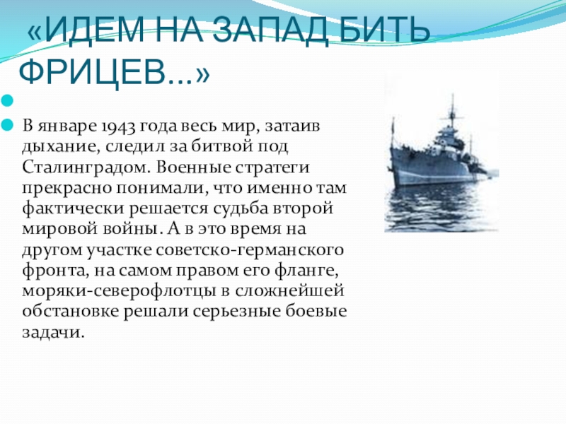 затаив дыхание, следил за битвой под Сталинградом. Военные стратеги прекрасно понимали, что именно там фактически решается судьба второй мировой войны. А в это время на другом участке советско-германского фронта, на самом правом его фланге, моряки-северофлотцы в сложнейшей обстановке решали серьезные боевые задачи.