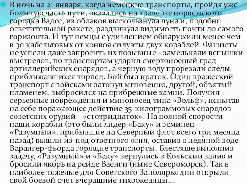 часть пути, оказались на траверзе норвежского городка Вадсе, из облаков выскользнула луна и, подобно осветительной ракете, раздвинула видимость почти до самого горизонта. И тут немцы с удивлением обнаружили менее чем в 30 кабельтовых от конвоя силуэты двух кораблей. Фашисты не успели даже запросить их позывные - замелькали вспышки выстрелов, по транспортам ударил смертоносный град артиллерийских снарядов, а черную воду прорезали следы приближавшихся торпед. Бой был краток. Один вражеский транспорт с войсками затонул мгновенно, другой, объятый пламенем, выбросился на прибрежные камни. Получил серьезные повреждения и миноносец типа «Вольф», испытав на себе поражающее действие 35-килограммовых снарядов советских орудий - «стотридцаток». На полной скорости наши корабли (это были лидер «Баку» и эсминец «Разумный», прибывшие на Северный флот всего три месяца назад) вышли из-под ответного огня, оставив в ледяной воде Варангер-фьорда горящие транспорты. Блестяще выполнив задачу, «Разумный» и «Баку» вернулись в Кольский залив и бросили якорь на рейде Ваенги (ныне Североморск). Так в наиболее тяжелые для Советского Заполярья дни открыли свой боевой счет вчерашние тихоокеанцы...