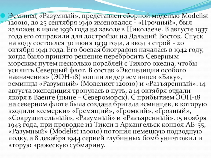 именовался - «Прочный», был заложен в июле 1936 года на заводе в Николаеве. В августе 1937 года его отправили для достройки на Дальний Восток. Спуск на воду состоялся 30 июня 1939 года, а ввод в строй - 20 октября 1941 года. Его боевая биография началась в 1942 году, когда было принято решение перебросить Северным морским путем несколько кораблей с Тихого океана, чтобы усилить Северный флот. В состав «Экспедиции особого назначения» (ЭОН-18) вошли лидер эсминцев «Баку», эсминцы «Разумный» (Моделист 120010) и «Разъяренный». 14 августа экспедиция тронулась в путь, а 14 октября отдали якоря в Ваенге (ныне – Североморск). С прибытием ЭОН-18 на северном флоте была создана бригада эсминцев, в которую входили «семерки» «Гремящий», «Громкий», «Грозный», «Сокрушительный», «Разумный» и «Разъяренный». 15 ноября 1943 года, при проводке из Тикси в Архангельск конвоя АБ-55, «Разумный» (Modelist 120010) потопил немецкую подводную лодку, а 8 декабря 1944 серией глубинных бомб уничтожил и вторую вражескую субмарину.