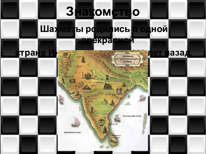 ЗнакомствоШахматы родились в одной прекраснойстране Индии примерно 2000 лет назад.