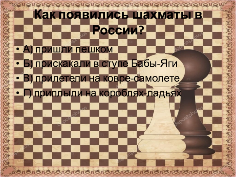Как появились шахматы в России?А) пришли пешкомБ) прискакали в ступе Бабы-ЯгиВ) прилетели на ковре-самолетеГ) приплыли на короблях-ладьях