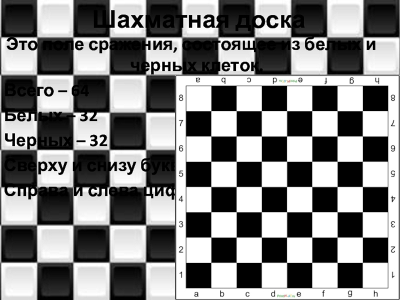 Шахматная доскаЭто поле сражения, состоящее из белых и черных клеток.Всего – 64 Белых – 32Черных – 32Сверху