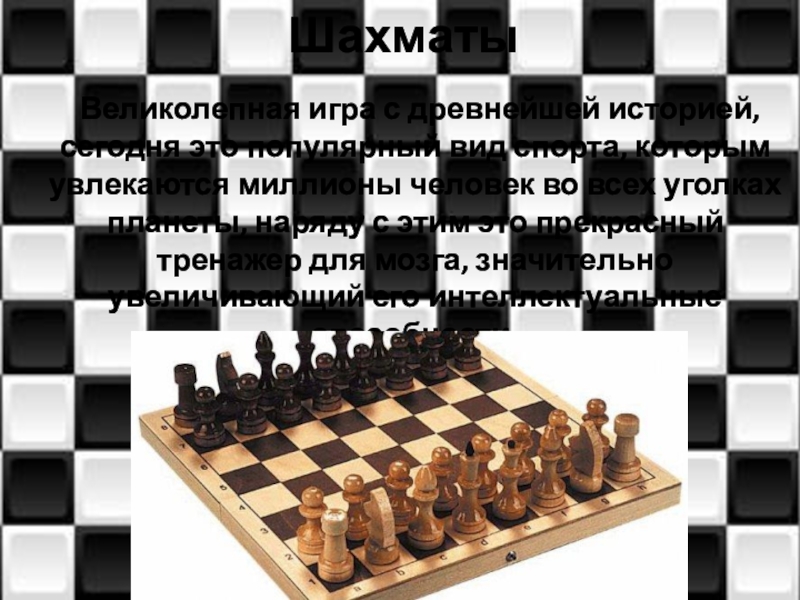 Шахматы 	Великолепная игра с древнейшей историей, сегодня это популярный вид спорта, которым увлекаются миллионы человек во всех
