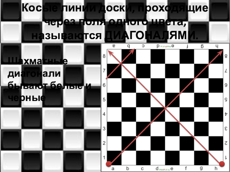 Слайд 12Косые линии доски, проходящие через поля одного цвета, называются ДИАГОНАЛЯМИ.