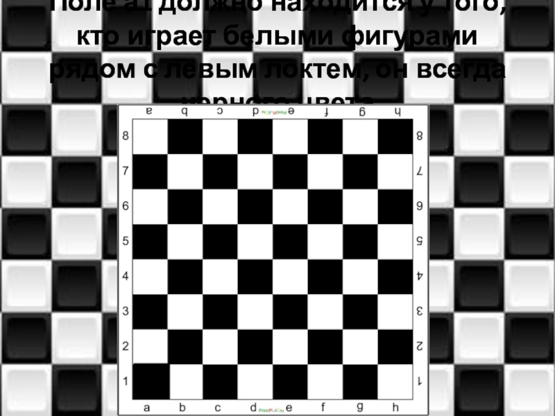Слайд 8Поле а1 должно находится у того, кто играет белыми фигурами рядом