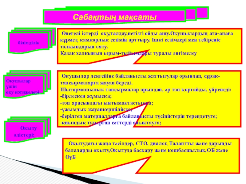 Өнегелі істерді оқу,талдау,негізгі ойды ашу.Оқушылардың ата-анаға құрмет, қамқорлық сезімін арттыру. Ішкі сезімдері мен тебіреніс толқындарын ояту.