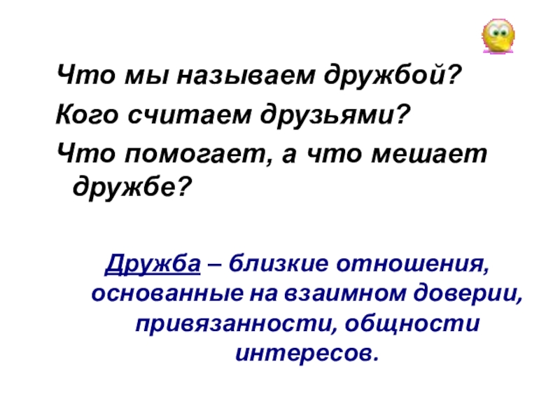 Дружба – близкие отношения, основанные на взаимном доверии, привязанности, общности интересов.