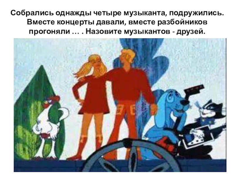 Слайд 35Собрались однажды четыре музыканта, подружились.Вместе концерты давали, вместе разбойников прогоняли …