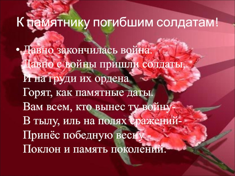 К памятнику погибшим солдатам!Давно закончилась война. Давно с войны пришли солдаты, И на груди их ордена Горят, как памятные даты. Вам всем, кто вынес ту войну- В тылу, иль на полях сражений- Принёс победную весну -