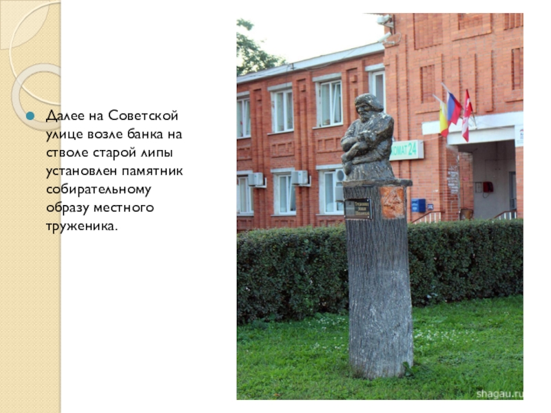 Слайд 10Далее на Советской улице возле банка на стволе старой липы установлен