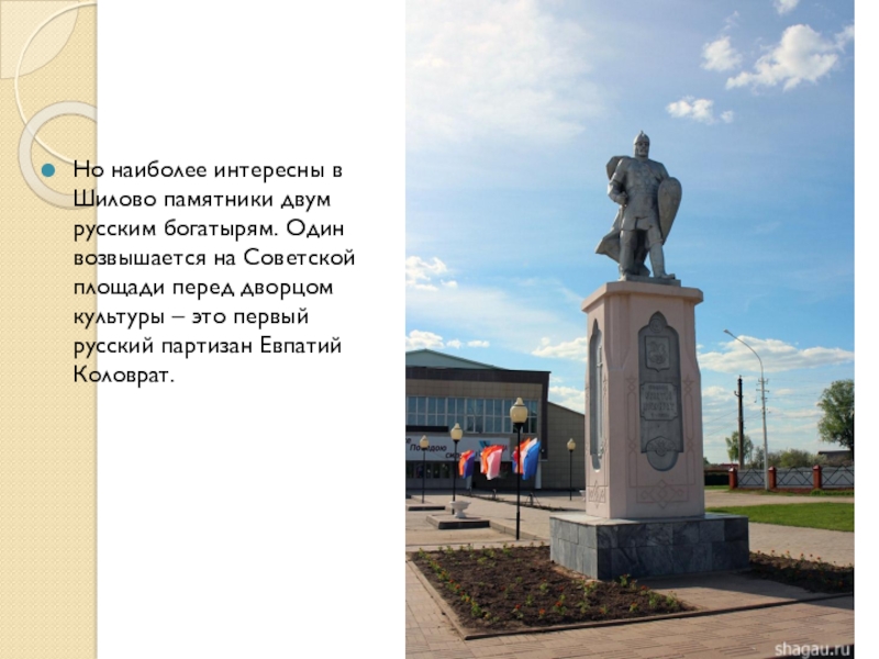 Слайд 11Но наиболее интересны в Шилово памятники двум русским богатырям. Один возвышается