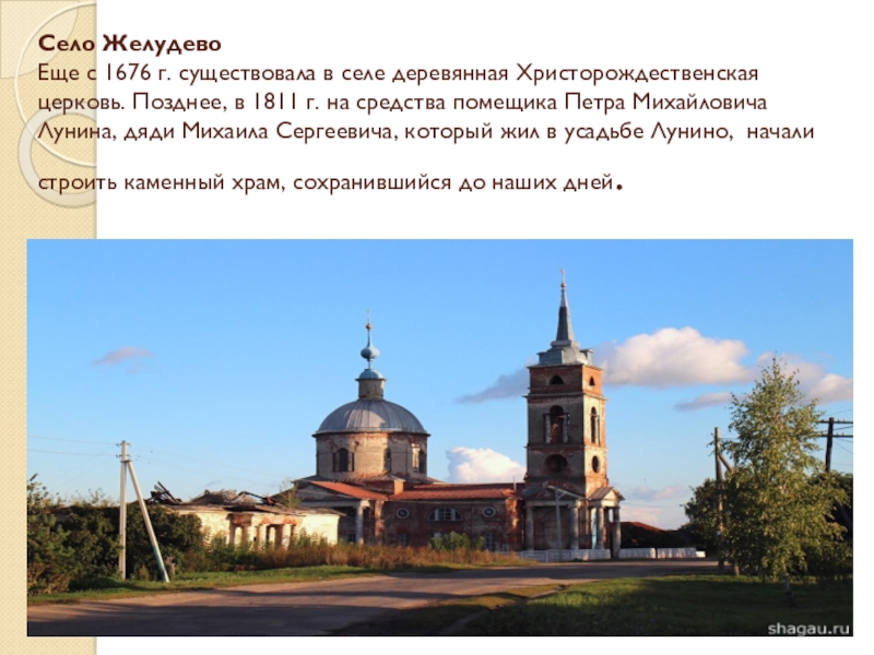 Позднее, в 1811 г. на средства помещика Петра Михайловича Лунина, дяди Михаила Сергеевича, который жил в усадьбе Лунино, начали строить каменный храм, сохранившийся до наших дней.
