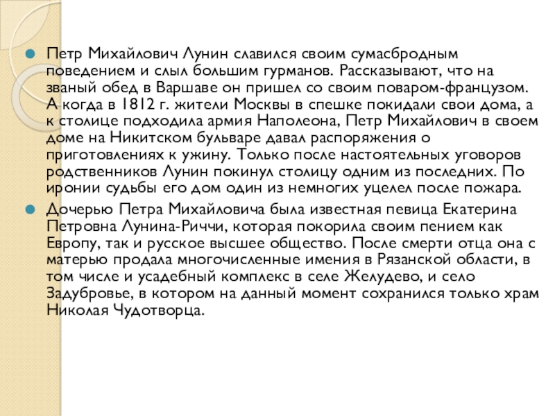 Слайд 15Петр Михайлович Лунин славился своим сумасбродным поведением и слыл большим гурманов.