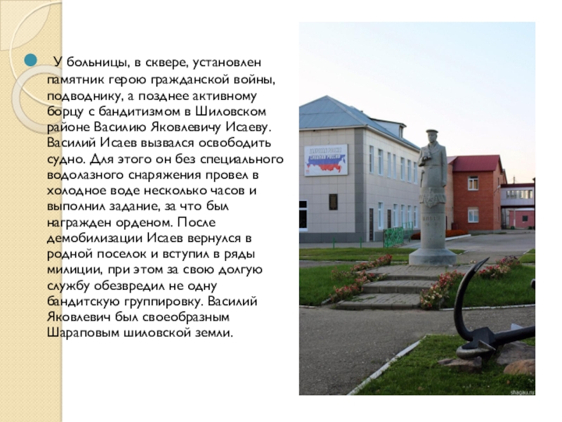 Слайд 9 У больницы, в сквере, установлен памятник герою гражданской войны, подводнику, а