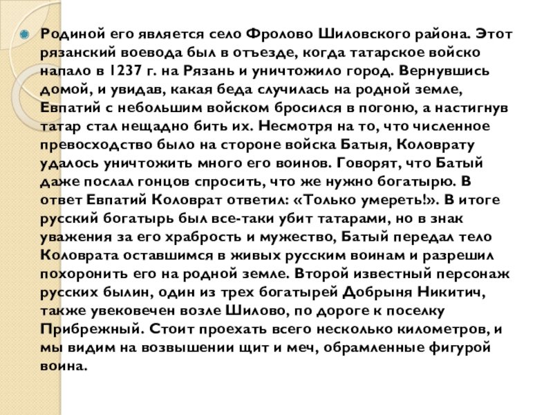 Слайд 12Родиной его является село Фролово Шиловского района. Этот рязанский воевода был