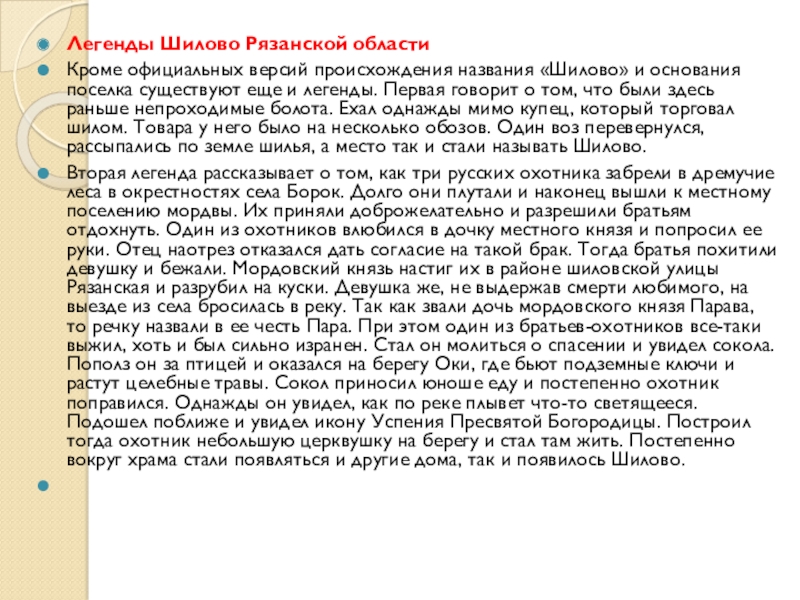Вторая легенда рассказывает о том, как три русских охотника забрели в дремучие леса в окрестностях села Борок. Долго они плутали и наконец вышли к местному поселению мордвы. Их приняли доброжелательно и разрешили братьям отдохнуть. Один из охотников влюбился в дочку местного князя и попросил ее руки. Отец наотрез отказался дать согласие на такой брак. Тогда братья похитили девушку и бежали. Мордовский князь настиг их в районе шиловской улицы Рязанская и разрубил на куски. Девушка же, не выдержав смерти любимого, на выезде из села бросилась в реку. Так как звали дочь мордовского князя Парава, то речку назвали в ее честь Пара. При этом один из братьев-охотников все-таки выжил, хоть и был сильно изранен. Стал он молиться о спасении и увидел сокола. Пополз он за птицей и оказался на берегу Оки, где бьют подземные ключи и растут целебные травы. Сокол приносил юноше еду и постепенно охотник поправился. Однажды он увидел, как по реке плывет что-то светящееся. Подошел поближе и увидел икону Успения Пресвятой Богородицы. Построил тогда охотник небольшую церквушку на берегу и стал там жить. Постепенно вокруг храма стали появляться и другие дома, так и появилось Шилово.
