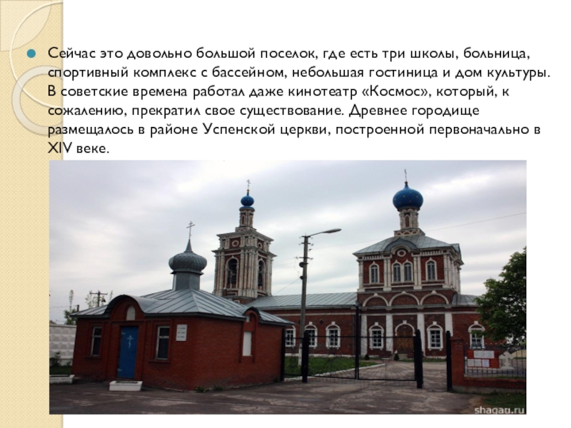 комплекс с бассейном, небольшая гостиница и дом культуры. В советские времена работал даже кинотеатр «Космос», который, к сожалению, прекратил свое существование. Древнее городище размещалось в районе Успенской церкви, построенной первоначально в XIV веке.