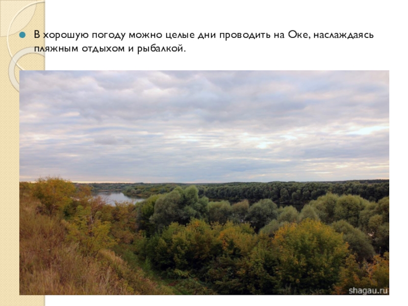 Слайд 3В хорошую погоду можно целые дни проводить на Оке, наслаждаясь пляжным