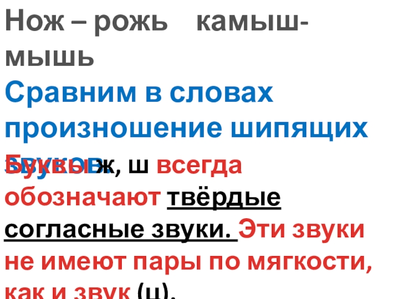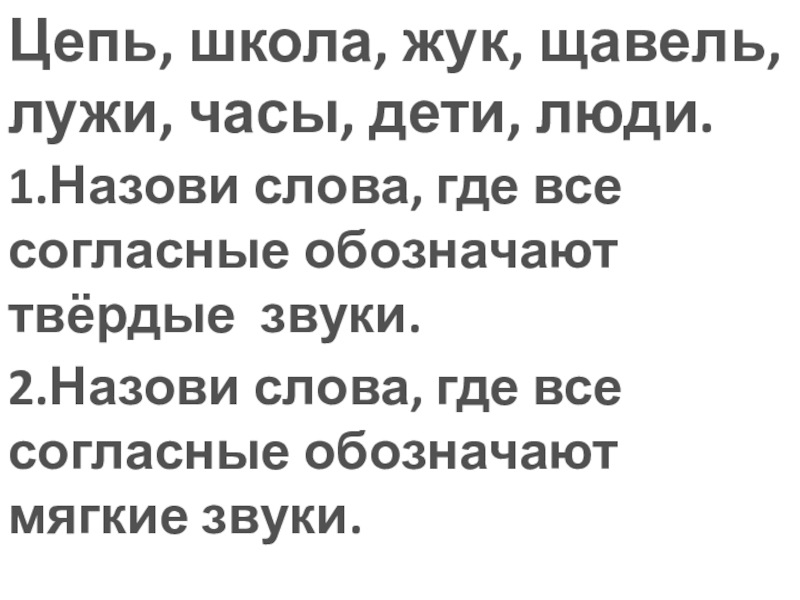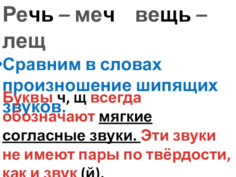 Буквы ч, щ всегда обозначают мягкие согласные звуки. Эти звуки не имеют пары по твёрдости, как и звук (й).
