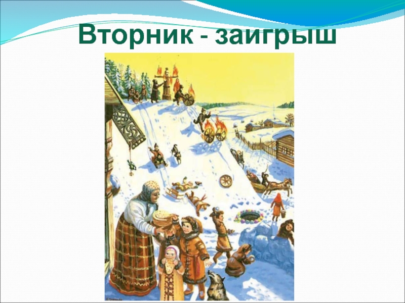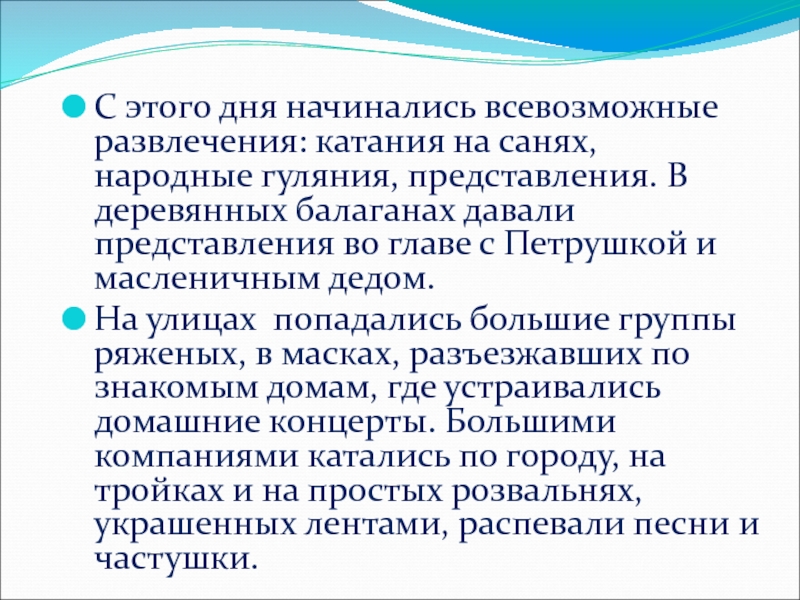 Слайд 9С этого дня начинались всевозможные развлечения: катания на санях, народные гуляния,