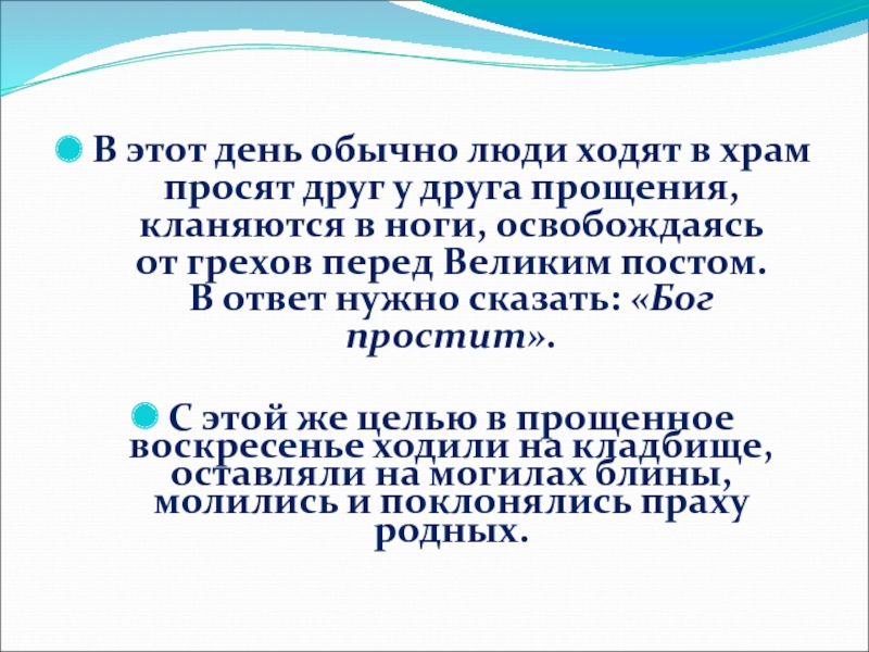прощения, кланяются в ноги, освобождаясь от грехов перед Великим постом. В ответ нужно сказать: «Бог простит».