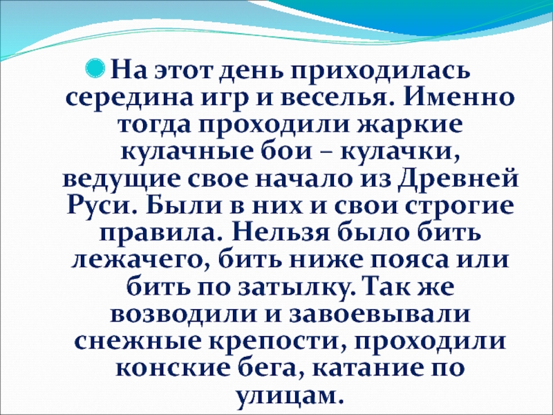 жаркие кулачные бои – кулачки, ведущие свое начало из Древней Руси. Были в них и свои строгие правила. Нельзя было бить лежачего, бить ниже пояса или бить по затылку. Так же возводили и завоевывали снежные крепости, проходили конские бега, катание по улицам.