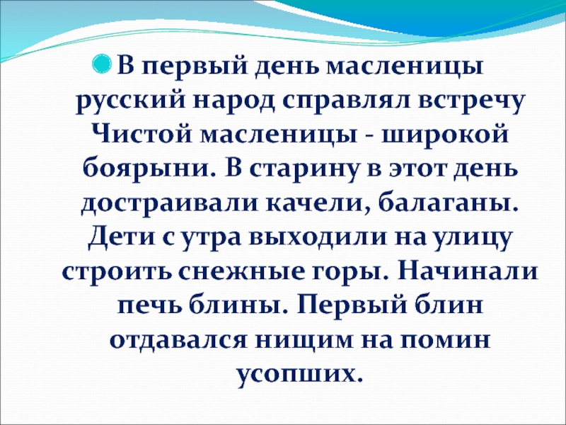 широкой боярыни. В старину в этот день достраивали качели, балаганы. Дети с утра выходили на улицу строить снежные горы. Начинали печь блины. Первый блин отдавался нищим на помин усопших.