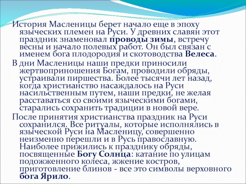В дни Масленицы наши предки приносили жертвоприношения Богам, проводили обряды, устраивали пиршества. Более тысячи лет назад, когда христианство насаждалось на Руси насильственным путем, наши предки, не желая расставаться со своими языческими богами, старались сохранить традиции в новой вере.